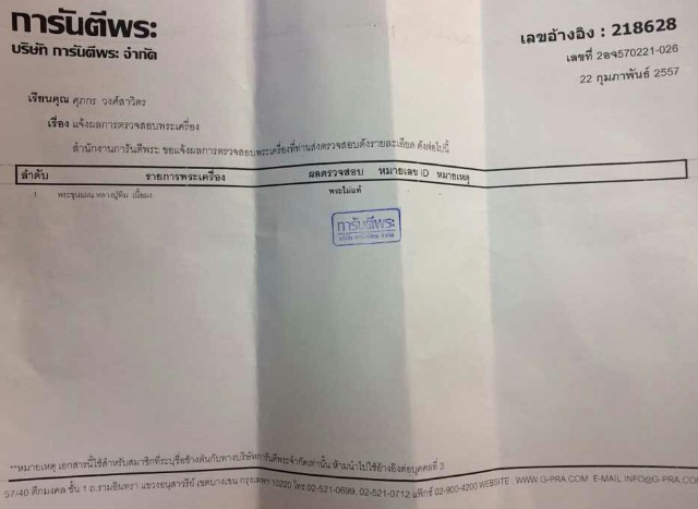 ผมซื้อพระผงหลวงปู่ทิม ผงพรายกุมารพิมภ์ใหญ่ เอาไปออกบัตร ผลออกมาว่า พระไม่แท้ แต่พระองค์นี้เคยออกบัตรมาแล้วเป็นพระแท้ สภาพใช่ เลยยืนให้พนักงานดู คำตอบคือ เอาบัตรแนบแล้วไปเช็คใหม่ ตกลงว่า งง งง อะไรของคุณ? ออกบัตรกันยังงี้ เก็บค่าออกบัตรก็แพง ความมาตรฐานก็ไม่มี ทั้งเจ้าของพระ และคนซื้อ ปวดหัวฉิบหาย ตกลงว่าคนดูพระดูไม่เป็น หรือว่าซี้ซั้วตี แท้ไม่แท้แล้วแต่อารมณ์ เพราะเวลาถามพระไม่แท้ต้องการรู้ว่าไม่แท้เพราะอะไร เพื่อเอาไปเป็นความรู้ กลับตอบว่าบอกไม่ได้เพราะเป็นความเห็นส่วนบุคคล ยังงี้ถ้าจะแย่ ดันเอาคนดูพระไม่เป็น มาซี้ซั้วออกบัตรกันอย่างนี้ก็เจ๊งสิครับลูกพี่ |