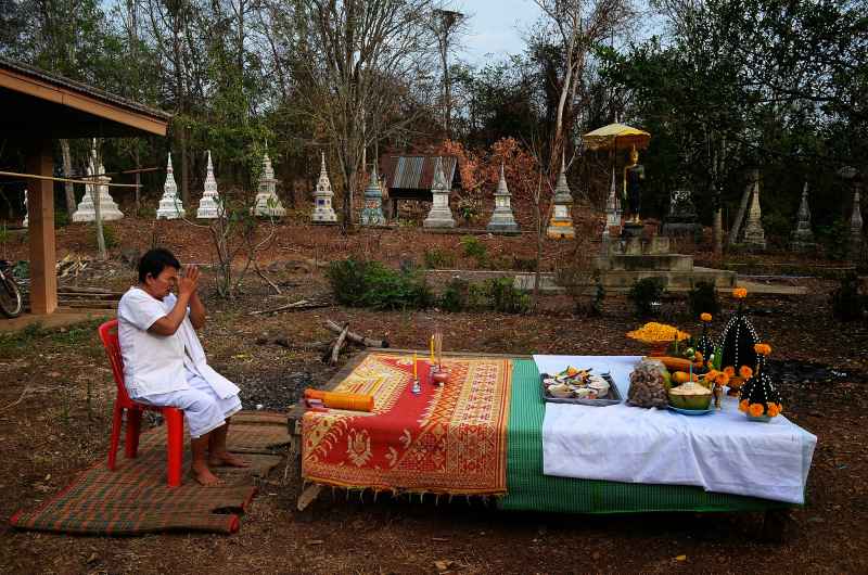 แม่ขาว( ร่างทรง ) ประกอบพิธีบรวงสรวง ในตอนเช้า แปดนาฬิกาเก้านาที ก่อนพิธีบวงสรวงฟ้าสว่างสดใส พอเริ่มพิธีบวงสรวง ปรากฏมีก้อนเมฆพากันพัดมาปิดจนมึดครึ้มไปทั่วทั้งวัด