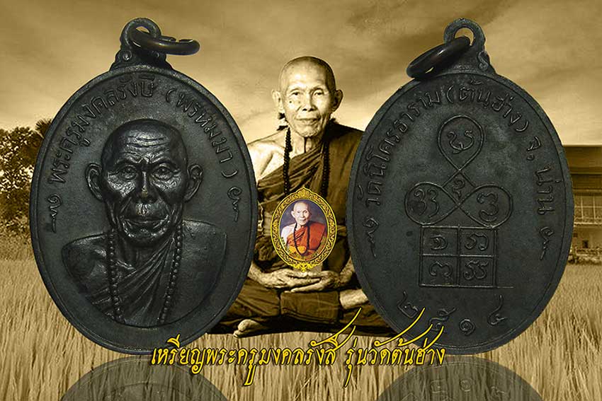 ลักษณะเหรียญ เป็นเหรียญรูปไข่ เนื้อทองแดงรมดำ จำนวนการสร้าง ๑,๐๐๐ เหรียญ โดยท่านพระครูพรหมวีระสุนทร เจ้าอาวาสวัดนิโครธาราม(ต้นฮ่าง) ตอนนั้น ขออนุญาตสร้างเพื่อหาปัจจัยสร้างเสนาสนะภายในวัดต้นฮ่าง อ.ท่าวังผา จ.น่าน จัดเป็นเหรียญยอดนิยมอีกรุ่นในจังหวัดน่าน |