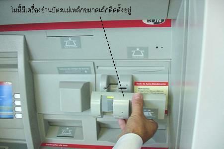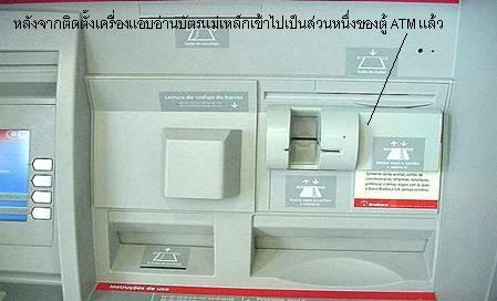 ตู้ ATM ที่มีลักษณะของที่เสียบบัตรยื่นออกมาจากตัวเครื่องมากๆแบบในรูป จะสามารถช่วยให้พวกหัวขโมยแอบติดตั้งเครื่องอ่านข้อมูลแบบบัตร ที่เป็นแถบแม่เหล็ก เช่นบัตร ATM ได้ง่าย แต่ในปัจจุบันเท่าที่ติดตามข่าวตามเวปต่างๆ ทราบว่าปัจจุบันในต่างประเทศเริ่มมีพวกหัวขโมยออกแบบเครื่องอ่าน ที่มีขนาดบางเท่าบัตร ATM โดยเอาใส่ลงไปในช่องเสียบบัตร ดังนั้นเวลาที่เสียบบัตร จะรู้สึกแน่นกว่าปกติ และเวลาที่เครื่องคืนบัตรออกมา ก็จะไม่โผล่ออกมาแบบที่เคยเป็น เพราะมีเครื่องอ่านข้อมูลแอบซ่อนอยู่ในช่องเสียบบัตรอยู่ก่อนแล้ว ดังนั้นเราต้องระวังการใช้บัตร ATM หากเจอสิ่งผิดปกติไว้ด้วย |