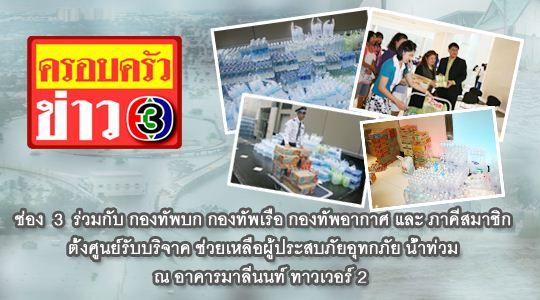 เนื่อง จากในขณะนี้ เกิดเหตุอุทกภัย ที่สร้างความเดือดร้อนอย่างหนักให้กับพี่น้องชาวไทยภาคกลางใน หลายจังหวัด อาทิ จังหวัดนครราชสีมา , ปราจีนบุรี, ลพบุรี ฯลฯ แล้วนั้น สถานีโทรทัศน์ไทยทีวีสีช่อง 3 ร่วมกับ กองทัพบก กองทัพเรือ กองทัพอากาศ และ ภาคีสมาชิก จึงขอมีส่วนร่วมในการเป็นตัวกลางในช่วยเหลือระหว่างท่านผู้ชม กับ ผู้ประสบภัยในครั้งนี้ จึงตั้งศูนย์ขึ้นมาเพื่อรับของบริจาค อาหาร น้ำ เทียน ไม้ขีด ไฟแช็ค ผ้าอนามัย รวมถึง ยากันยุง และ ยาแก้แมลงสัตว์กัดต่อย (ยุง แมลงป่อง ตะขาบ และ งู) ซึ่งได้ตั้งศูนย์รับบริจาค ที่ชั้น G อาคารมาลีนนท์ ทาวเวอร์ 2 โดยเปิดรับบริจาคทุกวันตั้งแต่บัดนี้เป็นต้นไป