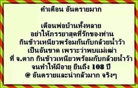 | หัวข้อกระทู้ : .......คำเตือน อันตราย !!...อย่าให้เมียกินกล้วยน้ำว้ากับข้าวเหนียวเด็ดขาด.. |