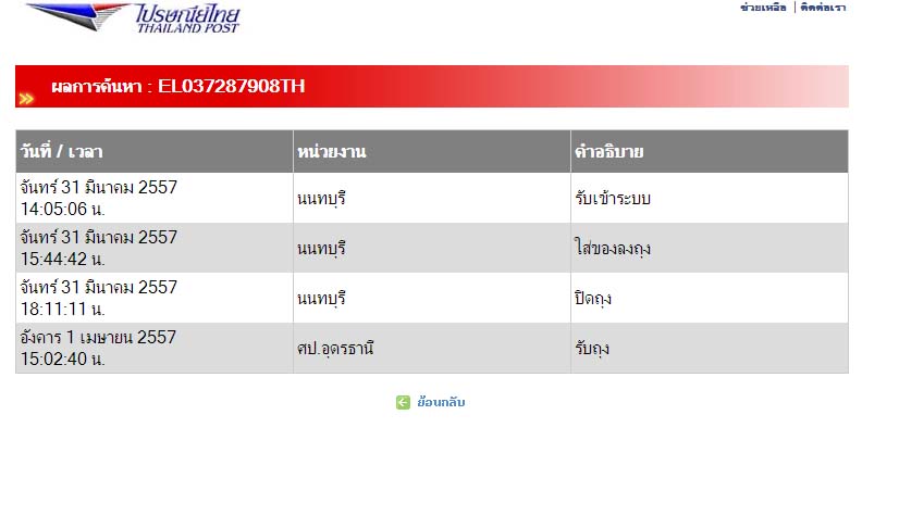 แต่เมี่อวันที่ 1/4/57 และ 2/4/57ผมเข้าไปเช็คดูสถานะความเคลื่อนไหวว่าถึงไหนแล้ว พบว่าเวลา 15.02 ของวันที่ 1 จนถึง 17.00 ของาันที่ 2/4/57สถานะบอกว่าถึง ศป.อุดรธานี ผมสงสัยว่าจัดส่งของไปที่นั่นหรือแค่กรอกข้อมูลผิด ครับช่วยเช็คให้ด้วย ขอบคุณมากครับ ด่วนมากๆ