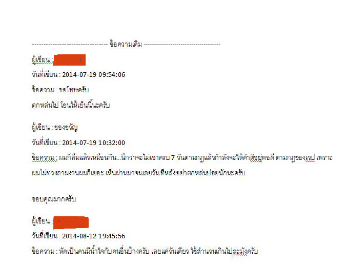 ผมลงประมูลพระไป มีสมาชิกปิดผมได้แล้วไม่โอนเงินครบเวลาที่กำหนดคือ 7 วัน พอถึงวันที่ 8 ผมกำลังจะให้คำติ เปิดมาเจอก็ได้ข้อความทักเข้ามา บอกว่า ทำรายการตกหล่น เดี๋ยวจะโอนให้ ตอนเย็น ซึ่งเป็นวันที่ 8 แล้ว และผมกำลังจะให้คำติไป ผมก็ให้โอนกาสและบอกว่า ทีหลังอย่าทำตกหล่นบ่อยนะครับ เพราะผมกำลังจะให้คำติไป เห็นไม่ติดต่อกลับมา และผมก็ส่งของไปให้ รอจนครบ 30 ท่านนี้ก็ไม่ให้ Feedback คำชมผม ซึ่งปกติแล้ว ผมคนขายควรให้คำชมลูกค้าก่อน แต่รายการนี้เขาโอนเลยเวลา ผมก็คิดว่าเขาจะมีน้ำใจ ให้คำชมผมก่อน แต่ก็ไม่ จน Feedback ให้โดยระบบ แล้วตอนเย็นก็เขียนเข้ามาต่อว่าผม ว่าไม่มีน้ำใจ ลองอ่านดูครับ ผมถามพี่ ๆ เพื่อน ๆ หน่อยเถอะครับ ว่าผมผิดหรือเขาผิดกันแน่...