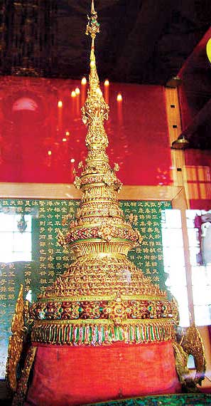 พระมหาพิชัยมงกุฎจำลอง ถือเป็นเครื่องมงคลราชบรรณาการ อันเป็นโบราณวัตถุที่ประเมินค่ามิได้ ทำจากทองคำแท้ เป็นมงกุฎทองประดับเพชร 233 เม็ด ทับทิม 2,298 เม็ด มรกต 46 เม็ด และไข่มุก 9 เม็ด