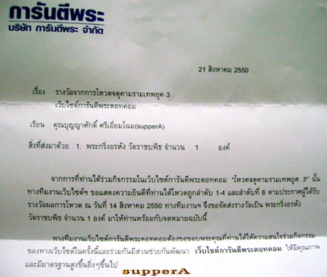 สิ่งดีสิ่งแรก คือได้รับ รางวัลจากการโหวตจตุคาม ยุค 3 กับทางเวปการันตี สวยงามถูกใจมาก ส่ง รวดเร็ว และบรรจุในกล่องอย่างดี ขอบคุณทางเวปการันตี มากคร้าบบบ