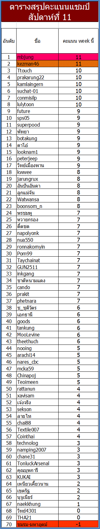 ขอแสดงความยินดีกับตำแหน่งอันดับสุดท้าย ประจำสัปดาห์ ที่ 11 พี่ ชมรม-มหาอุตม์