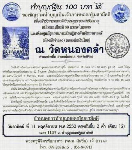 บอกบุญครับ สำหรับเพื่อสมาชิกทุกท่าน กระทู้นี้ผมนำบุญมาฝากครับ โดยขอเรียนเชิญร่วมทำบุญเป็นเจ้าภาพทอดกฐินสามัคคี ณ วัดหนองคล้า ต.ท่าขมิ้น อ.โพทะเล จ.พิจิตร เพื่อสร้างวิหารมหาเจดีย์ บรรจุพระบรมสารีริกธาตุ เฉลิมพระเกียรติ 80 พรรษาในหลวง และสร้างศูนย์อุทยานการเรียนรู้ทางด้านวิทยาศาสตร์ (ท้องฟ้าจำลอง) หลวงพ่อเงินใหญ่ครับ ซึ่งผู้มีจิตศรัทธา ที่ร่วมทำบุญ 100 บาท ขึ้นไป หลวงพ่อท่าน (พระครูพิจิตรพัฒนาทร เจ้าอาวาส) จะมอบ พระหลวงพ่อเงิน-จตุคามรามเทพ พร้อมสร้อยประคำ " รุ่นนี้ รวยเงินเหลือ " ให้ไว้เป็นที่ระลึกครับ ผมจึงขอนำมาบอกบุญกับเพื่อน ๆ ครับองค์จริงมีขนาด 3 ซ.ม. และขนาด 5 ซ.ม.ครับ เพื่อน ๆสามารถดูรายการพระได้จากกระทู้ พระเนื้อดิน ผง ว่าน หลังปี 2525 ครับ ผมขอเชิญเพื่อน ๆ มาทำบุญร่วมกันนะครับ เพราะกฐินนั้น ทำแค่ปีละครั้งครับ |