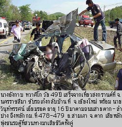 นายไชยา กล่าวว่า อุบัติเหตุทางถนนสะสมวันที่ 11-14 เม.ย. มีอุบัติเหตุเกิดขึ้นรวม 2,949 ครั้ง มากกว่าปี 2550 ที่มีจำนวน 2,821 ครั้ง หรือมากกว่า 128 ครั้ง คิดเป็นร้อยละ 4.54 มีผู้เสียชีวิตรวม 229 ราย น้อยกว่าปี 2550 ซึ่งมี 236 ราย น้อยลง 7 ราย คิดเป็นร้อยละ 2.97 มีผู้บาดเจ็บรวม 3,315 ราย มากกว่าปี 2550 ที่มีจำนวน 3,182 ราย หรือจำนวน 133 ราย คิดเป็นร้อยละ 4.18 จังหวัดที่เกิดอุบัติเหตุสะสมสูงสุด ได้แก่ เชียงราย 131 ครั้ง รองลงมา ได้แก่ เพชรบูรณ์ 129 ครั้ง จังหวัดที่มีผู้เสียชีวิตสะสมสูงสุด ได้แก่ เพชรบูรณ์ 11 ราย รองลงมาได้แก่ พิษณุโลก 10 ราย