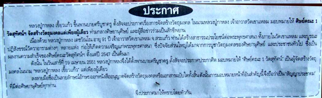 ผมเองก็นับถือหลวงปู่ ทั้งเก็บสะสม บูชาและซื้อขาย แต่หลังๆ ออกมาเยอะมากทำเป็นหมื่นๆ จากเดิมหลักพัน ตอนหลังหลานแท้ก็ลงหุ้นกับ สามสาว คณะหนึ่งวัดสุทัศน์ เมื่อสิ้นปี 50 คนละสองแสน แต่นั่นไม่ใช่ประเด็นครับ โดยส่วนตัวหลวงปู่อายุมากแล้ว 90 กว่า แล้วครับ ถ้าเป็นตาเป็นปู่ เราก็อยากให้ท่านพักได้แล้ว เพราะท่านเอง ก็ป่วย เข้าโรงพยาบาลเสมอ ศิษย์ทราบดี ปลุกเสกวัตถุมงคลครั้งใด้ก็ต้องเข้าโรงพยาบาล และศิษย์คณะ 1 ก็ดูแลรับผิดชอบ ตลอดมา ซึ่งก็เป็นสิ่งสมควร อายุขนาดนี้และอาการป่วย ซึ่งเกี่ยวกับปอด ต้องเดินทาง ไปมาระหว่างสระแก้วกับกรุงเทพตลอดเวลา แต่ด้วยความเมตตา ท่านไม่เคยขัด ใครขอก็ทำให้ตลอด ทั้งที่ผลกำไรตกกับใคร มากที่สุด ย่อมรู้ดี พออ่านประกาศ หลวงปู่ตั้งสัจจะ ให้ศิษย์คณะหนึ่ง จัดทำแต่เพียงผู้เดียว ผมว่าแปลกๆ ดูไม่อิสระเลย ผมรู้ว่ากระทู้นี้ อาจมีคนไม่พอใจ แต่เป็นความเห็นส่วนตัว ครับ และเชื่อมั่นว่า วัตถุมงคลทุกรุ่นของหลวงปู่ ทีหลวงปู่รับปากทำ มีพุทธคุณทุกรุ่น