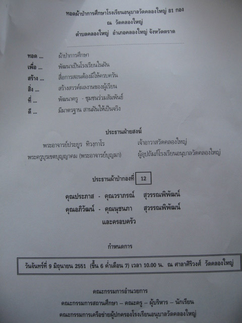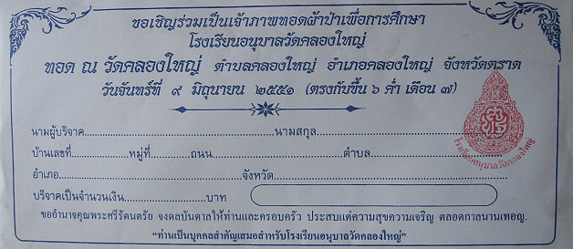 ด้วยโรงเรียนอนุบาลวัดคลองใหญ่ อำเภอคลองใหญ่ จังหวัดตราด (โรงเรียนในฝัน รุ่น 2) มีความประสงค์ที่จะหาเงินจำนวนหนึ่ง เพื่อปรับปรุงคุณภาพการเรียน การสอน พัฒนาเด็กให้มีคุณภาพตามมาตราฐาน จึงได้จัดทอดผ้าป่าขึ้น ณ ศาลาศิริวงศ์ วัดคลองใหญ่ อำเภอคลองใหญ่ จังหวัดตราด ในวันที่ 9 มิถุนายน 2551 เวลา 10.00 น. และขอเรียนเชิญท่านผู้มีจิตศรัทธาร่วมทำบุญกันครับ โดยผู้ที่ร่วมทำบุญ 100 บาท จะได้รับเหรียญอาจารย์วัน อุตตโม วัดถ้ำอภัยดำรงธรรม จังหวัดสกลนคร จำนวน 1 เหรียญ,ร่วมทำบุญ 200 บาท ได้รับเหรียญหลวงปู่ม่น วัดเนินตามาก จังหวัดชลบุรี รุ่นเจริญลาภ เนื้อทองแดง หรือ ทองเหลือง (แล้วแต่เลือก) จำนวน 1 เหรียญ และ ร่วมทำบุญ 300 บาท จะได้รับเหรียญหลวงพ่อโอด วัดจันเสน นครสวรรค์ รุ่น 6 รอบ จำนวน 1 เหรียญ ซี่งเหรียญทั้งหมดเป็นของที่ผมจัดหามาให้กับผู้ที่ร่วมทำบุญ โดยไม่หักค่าใช้จ่าย จึงขอเรียนเชิญทุกท่านมาร่วมกันเป็นเจ้าภาพในการทอดผ้าป่าด้วยกันนะครับ ผู้ที่ร่วมทำบุญกรุณาโอนเงินตามบัญชีที่แจ้งได้เลยครับ และลงที่อยู่สำหรับจัดส่งพระมาด้วยนะครับ และขอให้ผลบุญในครั้งนี้ ดลบันดาลให้ท่านและครอบครัว มีความสุข ความเจริญ มีสุขภาพพลานามัยที่แข็งแรง คิดหวังสิ่งใด ขอให้สมความปรารถนาตลอดไปครับ |