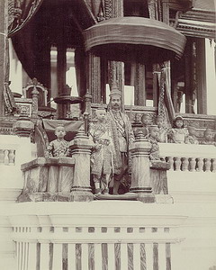 2. พระบาทสมเด็จพระจุลจอมเกล้าเจ้าอยู่หัวทรงยืนหันพระปฤษฎางค์ให้กล้องในการพระราชพิธีโสกันต์ ณ เขาไกรลาส ในสวนขวา พระบรมมหาราชวัง มีน้ำตกบ่อน้ำ และสัตว์ส่วนหนึ่ง ที่มีคติความเชื่อว่าอยู่บนเขาไกรลาส ในป่าหิมพานต์ คือ ม้าราชสีห์ ช้าง และ โค สัตว์เหล่านี้หล่อด้วยโลหะและมีน้ำพุ่งออกจากปาก เพื่อสรงน้ำพระราชโอรส พระราชธิดาที่ทรงรับพระราชทานโสกันต์ เมื่อปี พ.ศ. 2433