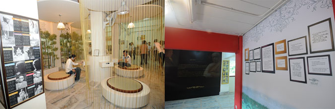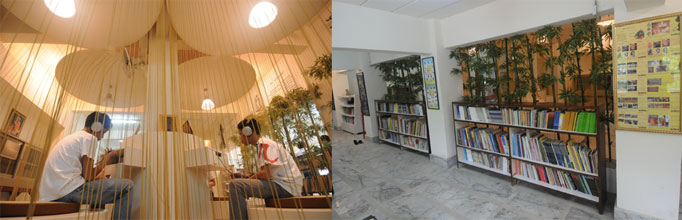 1. บริเวณที่นั่งอ่านหนังสือ ซึ่งถูกออกแบบให้นั่งอ่านหนังสือบนอาสนะทรงกลม ปูด้วยเสื่อตาตามิ โอบล้อมด้วยม่านไหมญี่ปุ่น เหนือเพดานกับโคมเพดานที่สาดฉายแสงอ่อนนวล ให้รู้สึกสงบ และให้ความเป็นส่วนตัว