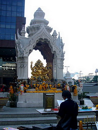 รู้จักกับที่มาของพระพิฆเนศกันแล้ว คราวนี้เรามาเริ่มเดินทางไปสักการะท่านกันดีกว่า สถานที่แรกที่ฉันจะพาไปนั้นก็อยู่บริเวณหน้าห้างสรรพสินค้าเซ็นทรัลเวิลด์ ใกล้สี่แยกราชประสงค์ ซึ่งถือว่าเป็นแหล่งรวมเทพเจ้าหลายๆ องค์ ทั้งพระพรหม พระตรีมูรติ พระอินทร์ พระนารายณ์ ฯลฯ และสำหรับองค์พระพิฆเนศนั้น ก็ประดิษฐานอยู่ใกล้ๆ กับพระตรีมูรติ คืออยู่ด้านริมสุดของห้างเซ็นทรัลเวิลด์ และมีผู้คนมากราบไหว้กันไม่ขาดสาย