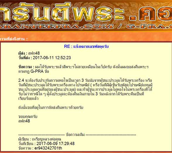 ผมได้รับพระฯแล้วสีพระฯไม่สวยเหมือนในเว็ปครับ ดังนั้นผมขอส่งคืนพระฯตามกฎ G-PRA ข้อ
