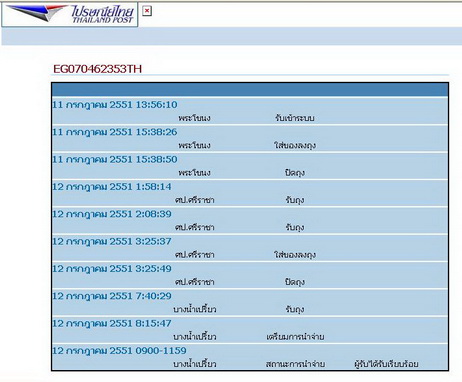 ตามที่คุณ dan999 ได้ประมูล เงินไหลมา 1 เนื้อก้นครก องค์ หยิน-หยาง ได้ เมื่อ วัน พฤ. ที่ 03 ก.ค. 2551 เวลา 00:37:50 น. ในราคา 1,103 บาท และเมื่อครบเจ็ดวันหลังการประมูล คุณได้โทรหาผม และแจ้งว่าขอโอนเงินภายในวันที่ 14-7-51 ผมจึงได้ ทำการจัดส่งพระองค์ดังกล่าวให้คุณก่อนโอนเงิน ในวันที่ 11-7-51 เวลา 13-56-11 น. หมายเลข EMS ที่ EG070462353TH และผู้รับได้รับของแล้ว เมื่อวันที่ 12-7-51 ( 09-11:59 บางน้ำเปรั้ยว ) แต่จากการเช็คยอดเงินโอน ที่