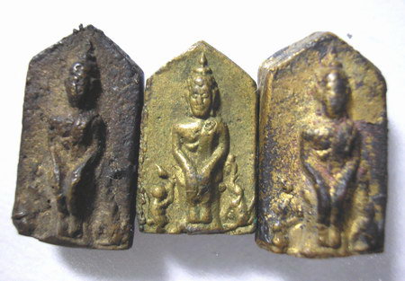 พระชุดเล็กที่น่าสะสม ถูกที่สุดในกระบวนพระหล่อของสายวัดสุทัศน์(เจ้าคุณศรี-สนธิ์)สร้างเมื่อปี2493-2494 องค์เล็ก ๆ น่ารัก แถมราคายังไม่แพงมากนัก หลักพันต้น ๆ จนถึงเกือบปลายหากเป็นพิมพ์ที่หายาก และมีน้อยเช่นพิมพ์ ป่าเลไลย์และพิมพ์นาคปรก ฯ ในขณะที่ของเริ่มน้อยลงมากในตลาดหาไม่ค่อยพบเจอแล้วครับ ของเก๊เพียบและหลากหลายฝีมือ ลองมาดูของฝีมือที่อยู่ในตลาดขณะนี้ และเปรียบเทียบกับของแท้ดูนะครับ เริ่มจากพิมพ์ยอดฮิตอันดับแรก พิมพ์ป่าเลไลย์ครับ จากรูปของแท้คือองค์ตรงกลางครับ จะเห็นได้ว่ามีขนาดเล็กกว่าของเก๊มาก ส่วนสององค์ด้านข้างเป็นของเก๊ที่ระบาดอยู่ทั่วไปในขณะนี้ จะเห็นได้ว่าของเก๊ด้านข้างทั้ง 2 องค์ทำผิวมาแตกต่างกัน องค์แรกจะทำให้ผิวคล้ำด้วยการย้อมสารเคมีบางชนิดแถมยังทำลักษณะพื้นผิวให้ขรุขระเพื่อให้สอดคล้องกับวิธีการสร้างคือเป็นพระหล่อเป็นช่อโดยใช้กรรมวิธีการหล่อแบบโบราณส่วนอีกองค์กระแสเนื้อเป็นพระแก่ทองและหลอกตาด้วยเนื้อหาของกระแสเนื้อพระที่ดูเหมือนลักษณะของโลหะต่างชนิดที่ยังไม่รวมตัวกันเป็นเนื้อเดียว ที่เด็ดไปกว่านั้นก็คือ มีการทำลักษณะของขั้วช่อให้หลงเหลืออยู่ และมีรอยตะไบทับ ซึ่งปัจจุบัน รอยตะไบแต่งพระเก๊มีการทำรอยตะไบแบบรอยหยาบเหมือนของแท้ แต่หากเวลาส่องพระลองพลิกไปมาจะเห็นร่องรอยความมันวาว และเหลือบสีรุ้งในรอยตะไบครับ ส่วนกระแสเนื้อหาของโลหะหากดูจากของแท้จะเห็นได้ว่า กระแสของพระแท้เนื้อหาจะออกเหลืองอมเขียวหรืออมน้ำตาล และจะเป็นพระแสเดียวกันหมดสำหรับพระเนื้อทองเหลืองที่ออกจากวัดในช่วงก่อนปี2500 ครับเนื่องจากพระหล่อสายวัดสุทัศน์ฯ มักจะต้องมีช่อชนวนของเดิมผสมอยู่ทุกครั้ง ลองชมดูนะครับ |