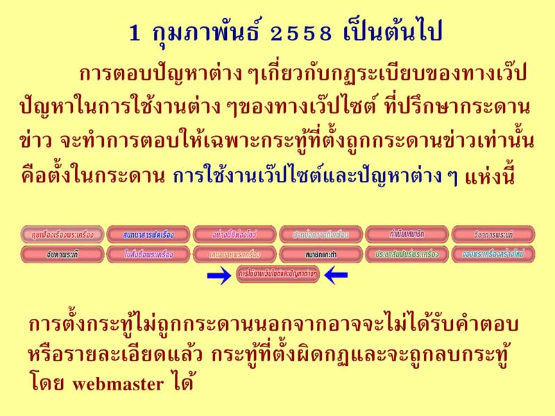 ผมและอาจารย์ลูกน้ำได้คุยกันและสรุปกันว่า ต่อไปการตอบปัญหาต่างๆของสมาชิกที่ถามเกี่ยวกับกฏระเบียบต่างๆของทางเว๊ป ปัญหาในการใช้งานเว๊ปไซต์ต่างๆ จะทำการตอบในกระดาน การใช้งานเว๊ปไซต์และปัญหาต่างๆ แห่งนี้เท่านนั้น