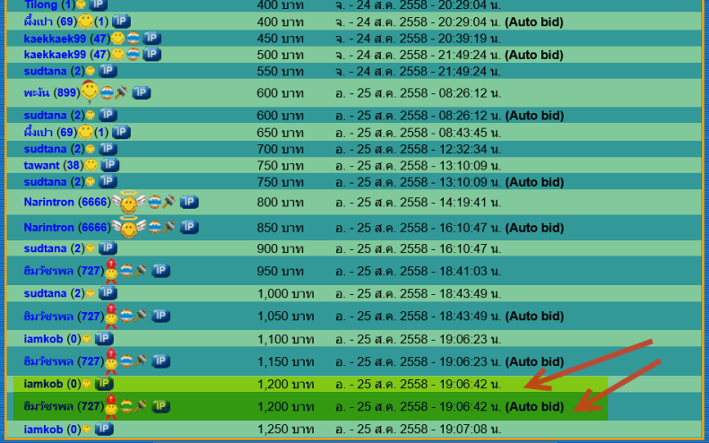 วันนี้ผมร่วมประมูลพระสมเด็จ 122 ปี ซึ่งปิดประมูลไปเมื่อตอน 19.14 ซึ่งผู้ร่วมประมู่ลได้ตั้ง auto bid ไว้ คือผมใส่ราคา 1100 เข้าไป ฝ่ายของผู้ร่วมประมูลที่ตั้ง auto ไว้ ก็ตอบกลับมาทันทีเป็น 1150 ผมก็เพิ่มเข้าไปเป็น 1200 เหมือนเดิมครับ ฝ่ายผู้ร่วมประมูลก็ตอบกลับมาเหมือนเดิมครับแต่ตัวเลขเป็น 1200 เท่าผม ผมก็ งง ว่า ถ้าหากเป็นแบบนี้ผมไม่ใส่ตัวเลขที่มากกว่าเข้าไปใหม่ ใครจะเป็นผู้ชนะการประมูลครับ (สมาชิกใหม่ครับ) |