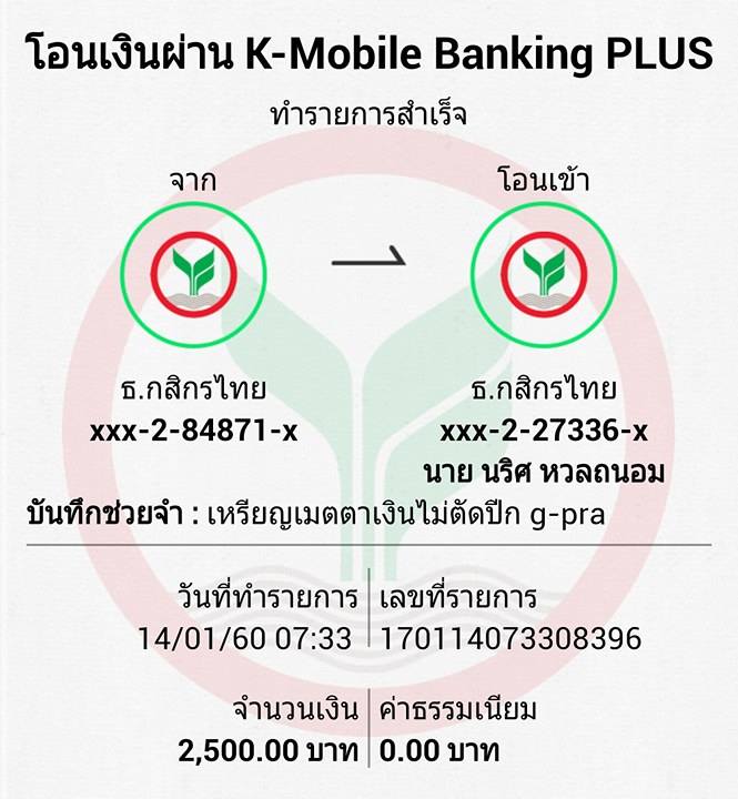 4.เช้าวันที่ 14 เวลา 07.33น. ผมโอนเงินจำนวน 2500 บาทให้ผู้ตั้งประมูล