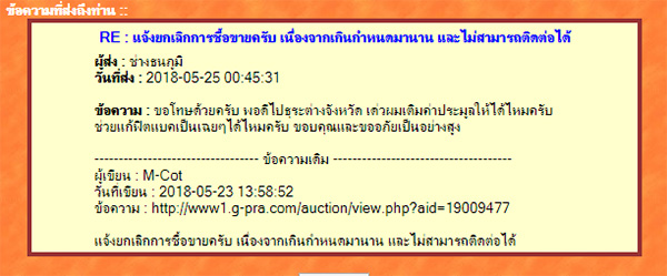 เนื่องจากสมาชิกท่านนี้ปิดพระ และไม่โอนเงินในกำหนด จนเกินระยะเวลาไปนาน ผมพยายามติดต่อทั้งส่ง Mailbox ไปหลายวันก็ไม่เปิดอ่าน ติดต่อทางเบอร์โทรศัพท์ในระบบหลายครั้งก็ไม่สามารถติดต่อได้ จึงส่งข้อความเพื่อยกเลิกการซื้อขาย เพื่อนำรายการดังกล่าวมาลงใหม่ พร้อมให้คำติตามกฏ