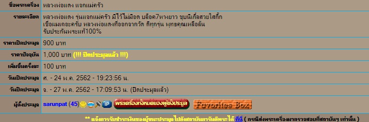 ทางเวปก็แจ้งออกมาแล้วว่าพระแท้ เพราะฉะนั้นในรายละเอียดผมระบุไว้ว่าผมรับประกันว่าพระแท้ แต่ผมไม่ได้ระบุปีสร้าง ซึ่งผมเองก็ไม่ทราบ ทราบเพียงแต่ว่า พระแท้ บล็อค7หางยาว แค่นั้น