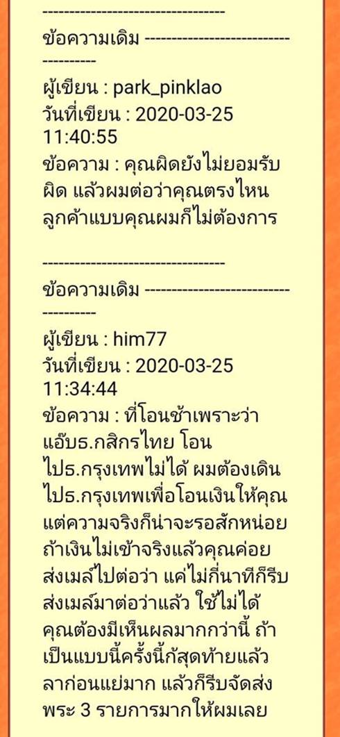 2. การที่ผมแจ้งเมล์กลับไป โดยใช้คำขึ้นต้นว่า ขออภัย และในข้อความนั้น มีคำไม่สุภาพ หรือต่อว่าใดๆ บ้างหรือเปล่า โดยปกติแล้วผู้ตั้งประมูล ก็ควรต้องแจ้งกลับไปหรือไม่ถ้าผู้ชนะ ประมูลแจ้งการโอนเงินแล้วไม่มีเงินเข้า ซึ่งการโอนเงินมาในบางกรณี โดนตัดเงินไปแล้ว แต่เงินไม่เข้าก็มี(เกิดจากปัญหาระหว่างธนาคาร ด้วยกัน) ผมแจ้งเมล์กลับไป จากที่คุณแจ้งการโอนเงินเวลาห่างกัน 17 นาที ซึ่งผมก็ทิ้งระยะเวลา พอสมควร เมื่อถึงเวลา 11.15 น. ถึงมีเงินเข้ามา แล้ว เวลา 11.17 น. คุณโทรเข้ามาแจ้งว่าโอนเงินผ่านมือถือไม่ได้ ถึงไปเข้าเงินหน้าเคาร์เตอร์ ซึ่งผมก็บอกแต่เพียงว่าคุณทำผิดขั้นตอน(คือการโอนเงิน หรือเอาเงินเข้าบัญชีผม แล้วค่อยแจ้งการชำระเงิน)