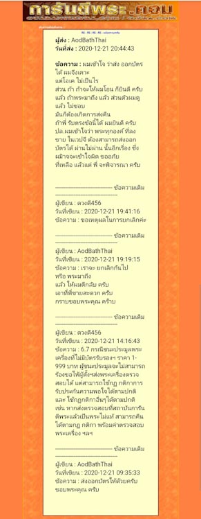 เนื่องจากสมาชิกชนะประมูลพระไปในราคา200บาท ซึ่งสมาชิกมีเจตนาอยากยกเลิกและให้เหตุผลว่าไม่เข้าใจกฎ (ปล.ผู้ชนะเป็นสมาชิกมีค้อนตั้งประมูลและมีฟีดแบ็คเกือบ184ฟีดแบ็ค) ทั้งนี้ได้โทรมาเจรจาว่าถ้าขอยกเลิกและผู้ตั้งจะให้คำติก็จะขอให้ผู้ตั้งส่งพระไปให้และทางเขาจะส่งกลับมาเพื่อไม่ให้เกิดคำติ ผลของเรื่องนี้ควรเป็นไปในทิศทางใดคะ เพราะทั้งสองทางก็มีแต่ผู้ทั้งเสียเปรียบ จึงเรียนปรึกษาท่านที่ปรึกษามา ณ.ที่นี้ ขอบคุณค่ะ |