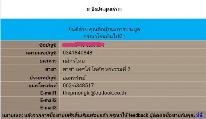 หมายเหตุ - ผมรับทราบกฎ กติกา ข้อ 2.7 ที่กำหนดว่าผู้ตั้งประมูลสามารถจัดส่งพระ ภายใน 3 วัน หลังจากรับเงินค่าพระแล้ว แต่ในเมื่อ mailbox ผู้ตั้งประมูลก็ยังไม่สนใจที่จะเปิดอ่าน แล้วจะจัดส่งพระได้ในวันใด |