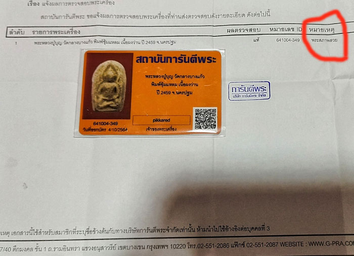 วันนี้ได้รับพระพอแกะดู บัตรรับรองทางสนง ลืมลงสภาพสวยไว้ให้ครับ ในใบรายงานผลก็ยังลงว่าสภาพสวย แต่บัตรแข็งสนง ไม่ได้ลงให้ครับ