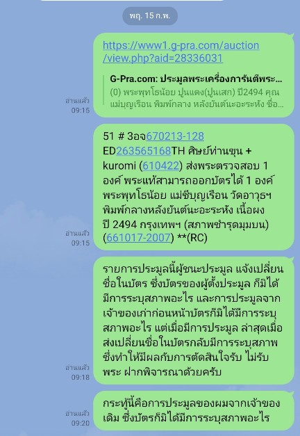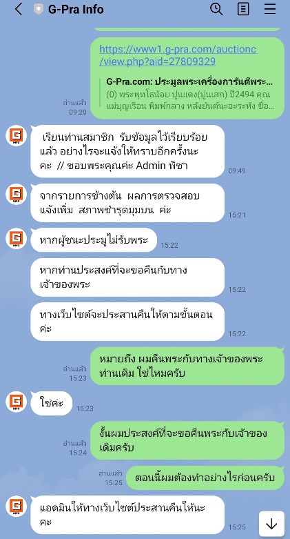 ได้ชนะประมูลพระ ส่งพระพร้อม ออกบัตรเปลี่ยนชื่อ ตามขั้นตอน พระไม่ระบุสภาพอะไร(บัตรเก่าก็ไม่ระบุสภาพ) แต่พอเป็นผู้ขายบ้าง คนชนะประมูลส่งออกบัตรเปลี่ยนชื่อ เจอระบุสภาพชำรุด Recall เพื่อคืนไปยังเจ้าของเดิม เราเป็นผู้ได้พระเป็นมือสุดท้าย g-pra ติดต่อกลับมา บอกมือที่ 2 ไม่พร้อม ให้รอมีเงินคืนก็ไม่รู้เมื่อไหร่ ถ้าจะคืนเงินค่าพระได้แค่บางส่วน หรือจะเอาพระคืนไปขายเอง คือสรุปโดนอย่างเดียว รีบคืนเงินผมมา และพอกันทีกับ g-pra ครับ |