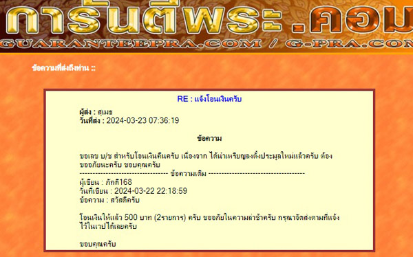 ปิดประมูลไปเมื่อ 13/3/2567 สมาชิกไม่โอนเงินตามเวลาที่กำหนด ผมจึงให้คำติไปเมื่อ 22/3/2567 จากนั้นเวลา 22.18 น.วันเดียวกัน ลูกค้าโอนเงินและแจ้งให้จัดส่ง เช้าวันรุ่งขึ้น 23/3/2567 เวลา 07.36 น. ผมได้ขอเลข บ/ช เพื่อโอนเงินคืน แต่ไม่ได้รับการติดต่อกลับมา(อ่านข้อความแต่ไม่ตอบกลับ) เบอร์โทรศัพท์ ไม่สามารถติดตอได้ จึงขอตั้งกระทู้นี้เพื่อเป็นหลักฐานว่า ผมได้ปฏิบัติตามกฏทุกประการครับ หากได้รับการติดต่อกลับมาจะโอนเงินกลับไปให้ทันทีครับ |
