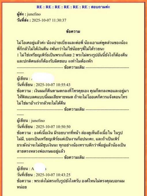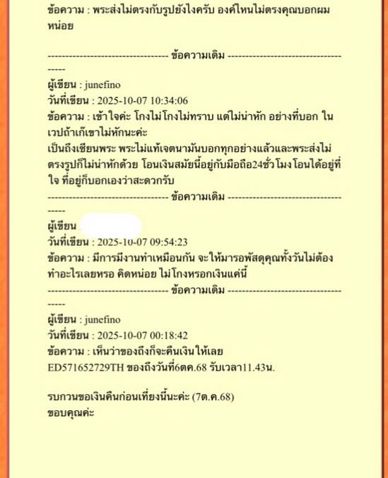 และเมื่อทราบก็รีบติดต่อกลับขอคืน แต่ลักษณะการพูดไม่เหมือนเดิม ดิฉันก็ค่อนข้างเกรงใจ ได้บอกแล้วว่าพระไม่แท้ ไม่ใช่งานเพิร์ท และไม่ได้เหมือนในรูปที่ส่งมา คุยอยู่นาน ,ฉันกลัวไม่ได้เงินคืน ก็เลยขอให้หักเงินที่เราติดต่อซื้อ 4110เหลือ4000 คือทั้งพระไม่ตรงรูปและไม่แท้ และยังเป็นเงินชุบ แต่เขาอ้างเรื่องหักเปอร์เซนต์ หักค่าส่ง ค่าน้ำมัน ประมาณเสียเวลาด้วยเพราะไม่ได้ส่งทางไปรษณีย์ไทย ต้องหักมากกว่านี้ถ้าอยากจะคืน ก็เลยตามเขาว่าไปก่อน (ตรงนี้ยืนยันว่ามีสิ่งที่ยืนยันได้ เรื่องค่าส่งค่าน้ำมันทั้งในและนอกเวป) ดิฉันกลัวไม่ได้คืนจริงๆ ก็เลยเอาตามที่เขาว่า และได้แจ้งไปแล้ว ว่าเวปจี จะลงพระเก๊ไม่ได้ และ เก๋ ก็หักไม่ได้