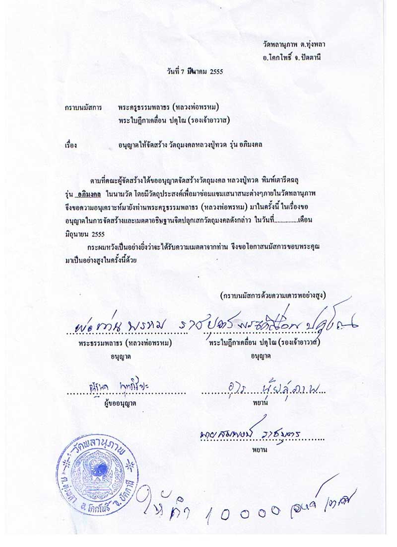 เอารูปใบอนุญาตจัดสร้างและภาพหลวงพ่อพรหม วัดพลานุภาพ เซ็นใบอนุญาตให้จัดสร้างหลวงปู่ทวด รุ่น "อภิมงคล" มาให้ชมกันครับ..... และท่านมอบแผ่นจารอักขระ แผ่นเงิน,ทอง,ทองแดง....มาเป็นมวลสารในการจัดสร้างครั้งนี้ ส่วนกำหนดการปลุกเสก รอทางหลวงพ่อท่านดูฤกษ์ให้อยู่ครับ ....ช่วงปลายเดือนมิถุนายน...น่าจะกำหนดรับพระต้นเดือนกรกฏาคม |