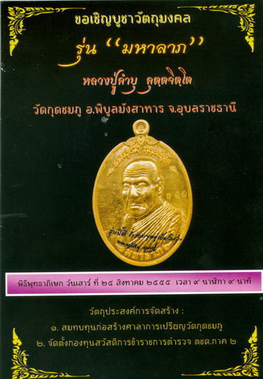 ขอเชิญสั่งจองบูชาวัตถุมงคล หลวงปู่คำบุ คุตฺตจิตฺโต รุ่น มหาลาภ