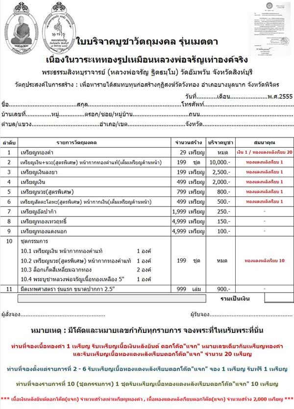 แจ้งข่าวดีสำหรับท่านที่ร่วมบุญสั่งจองบูชาวัตถุมงคลรุ่น"เมตตา" เนื่องจากมีผู้ให้ความสนใจและมีการร่วมบุญสั่งจองบูชาเข้ามาเป็นจำนวนมากเกินกว่าที่คาดไว้ ทางคณะกรรมการจึงมีมติจัดสร้างเหรียญขึ้นมาจำนวน 2,000 เหรียญ (ตอกโค๊ด ไม่มีหมายเลข) เพื่อสมนาคุณและเป็นการขอบคุณ แก่ผู้ที่ได้สั่งจองบูชาร่วมบุญสมทบทุนก่อสร้างกุฏิสงฆ์วัดวังทอง อำเภอบางมูลนาก จังหวัดพิจิตรในครั้งนี้ครับ โดยเหรียญจำนวนหนึ่งจะนำแจกจ่าย แก่ผู้ที่ได้มาเข้าร่วมพิธีอธิษฐานจิตปลุกเสกที่วัดอัมพวันครับ ^^ |