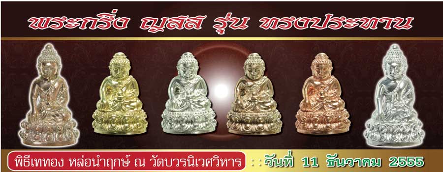 ขอเชิญร่วมพิธีเททองหล่อนำฤกษ์ พระกริ่ง ญสส รุ่น ทรงประทาน ณ วัดบวรนิเวศวิหาร หน้าพระอุโบสถรังสี (สนามบาส ร.ร. วัดบวรนิเวศ ) ในวันที่ 11 ธันวาคม 2555........ เริ่มบวงสรวง เวลา ประมาณ 14.00 น. เริ่มเททองหล่อนำฤกษ์ เวลา 14.39 น. มีเจ้าประคุณสมเด็จพระวันรัต เป็นประธานเททองในวันงาน โดยมีพิธีหล่อดินไทยพระกริ่งองค์นำฤกษ์ และมีพระเกจิอาจารย์มาร่วมพิธีในวันงาน ดังนี้