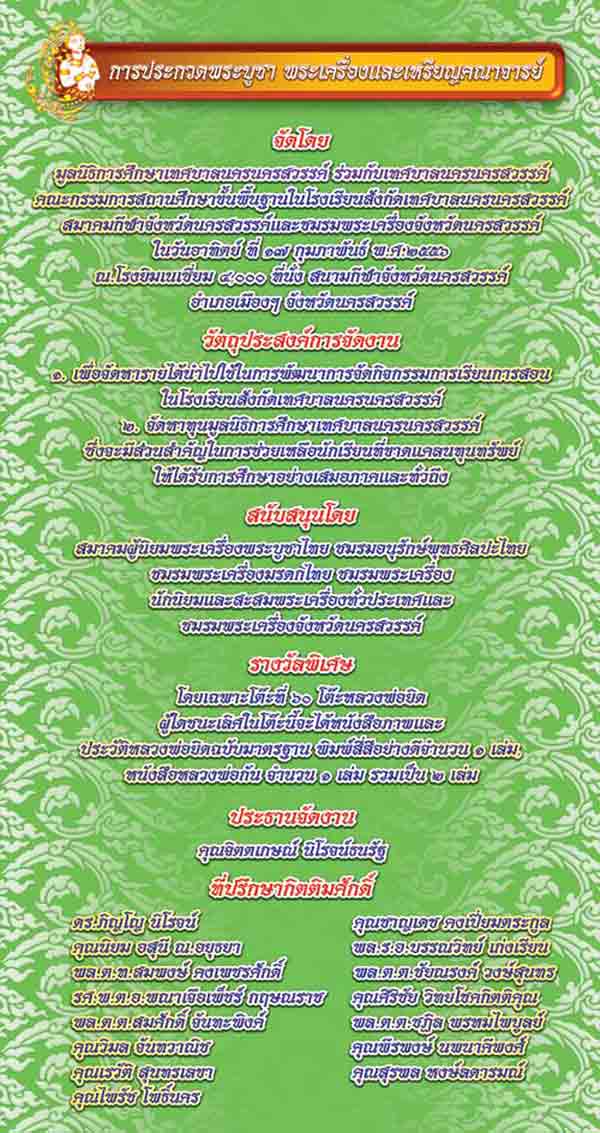 | หัวข้อกระทู้ : แจ้งข่าวงานประกวดพระ จ.นครสวรรค์ (รายการประกวดสายพระอาจารย์จิ) |