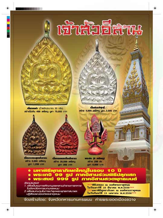 นับเป็นครั้งแรกที่ทางวัดพระธาตุพนม ที่ได้อนุญาตให้จัดสร้าง ทั้งเททองและมหาพุทธาภิเษก ณ องค์พระธาตุพนม ซึ่งเป็นที่สักการะบูชาของคนทั่วโลก สมควรที่เราท่านทั้งหลายต้องจับจองเป็นเจ้าของ บอกได้คำเดียวว่า สุดยอดทั้ง มวลสารและพิธี ทางผู้จัดสร้างได้นิมนต์เกจิคณาจารย์ทั่วทั้งภาคอีสาณ มาอธิฐานจิตวิทยาคมลงสู่เหรียญ"เจ้าสัวอีสาณ" เหรียญดี เหรียญสวย พุทธคุณล้นเหลือ เจตนาบริสุทธิ์ |