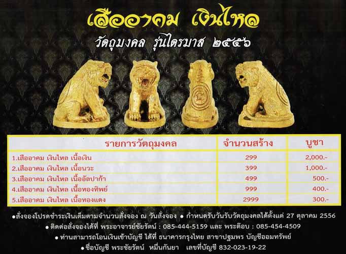 ....ประชาสัมพันธ์ มีข่าวมาบอก ช่วงไตรมาสนี้ ทางวัดพรุตะเคียนได้สร้างเสืออาคม เพื่อสร้างหอพระไตรปิฏก ด้วยความเมตตา ของหลวงพ่อโปร่ง วัดถ้ำพรุตะเคียน อ.ท่าแซะ จ.ชุมพร ได้สร้าง เสืออาคมตัวใหญ่ เพื่อให้ชาวบ้านละแวกใกล้เคียงและประชาชนทั้วไปได้บูชากัน เป็นเอกลักษณ์เสือใหญ่ของวัดพรุตะเคียน และหลวงพ่อโปร่งตั้งใจปลุกเสกเดี่ยวให้ช่วงเข้าพรรษานี้ สำหรับท่านที่ยังไม่มีเสือหลวงพ่อโปร่ง ไม่ควรพลาดด้วยประการทั้งปวงนะครับ พระชุดนี้วัดสร้างเอง จึงเปิดรับจองที่วัดถ้าพรุตะเคียนเป็นหลักด้วยจำนวนสร้างที่น้อยมีไม่มาก คาดว่าช่วงออกพรรษา เสืออาคมตัวนี้คงหมดแน่นอนครับ ผมได้ช่วยทางวัดประชาสัมพันธ์มาตั้งแต่ต้นได้รับความเมตตาจากทางวัดไห้ยอดมาพอสมควร เปิดให้จองในเวบยูที่นี่ที่เดียว เร็วๆนี้ครับ รายละเอียดจะนำมาบอกกล่าวในโอกาสต่อไปครับ จำนวนสร้าง เสืออาคมรุ่นเงินไหล หลวงพ่อโปร่ง โชติโก วัดถ้ำพรุตะเคียน เนื้อทองคำ สร้างตามจองไม่เกิน 29 ตัว ราคาจอง 99,999 บ. (นน.ประมาณ 45-50 กรัม) เนื้อเงินบริสุทธิ์ จำนวนสร้าง 299 ตัว ราคาจอง 2,000 บ. เนื้อนวะโลหะ จำนวนสร้าง 399 ตัว ราคาจอง 1,000 บ. เนื้ออัลปาก้า จำนวนสร้าง 499 ตัว ราคาจอง 500 บ. เนื้อทองทิพย์ จำนวนสร้าง 999 ตัว ราคาจอง 400 บ. เนื้อทองแดง จำนวนสร้าง 2,999 ตัว ราคาจอง 300 บ. สนใจรายละเอียดเพิ่มเติม ติดต่อวัดถ้ำพรุตะเคียน พระอาจารย์ชัยรัตน์ 085-4445159 และพระต็อบ 085-4544505 รายได้ทั้งหมดเพื่อสร้างหอพระไตรปิฎก วัดถ้ำพรุตะเคียน อ.ท่าแซะ จ.ชุมพร กำหนดปิดรับจอง30กันยายน2556 รับพระ27ตุลาคม2556 เป็นต้นไป วัตถุมงคลทุกรายการ ตอกโค๊ดพร้อมหมายเลข ตลับใส่อย่างดีจากโรงงานวิชั่นครับ |