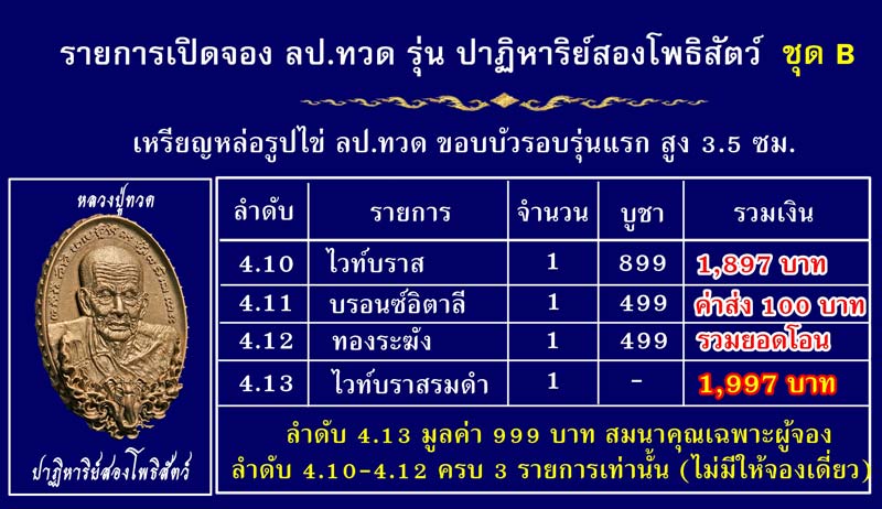 ชุด A จะเป็นรูปหล่อลอยองค์ ลป.ทวด ฐานบัว 4 ชั้น สูง 1.2 นิ้ว อุดกริ่งมวลสาร โดยเปิดจองเป็น set 3 รายการ + รายการสมนาคุณ 1 รายการ
