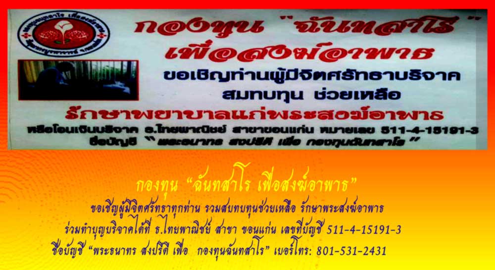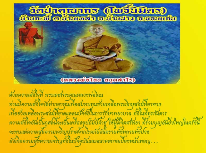 ด้วยพระเดชพระคุณหลวงพ่อไฉน ฉันทสาโร ท่านมีความตั้งใจจัดทำกองทุน เพื่อช่วยค่ารักษาพยาบาลพระสงฆ์ที่อาพาธ ทั้งในที่ธุรกันดาร โอกาสันเป็นมหากุศล จึงนอเรียนเชิญพี่ๆผู้มีจิตศรัทธาร่วมบุญในครั้งนี้คับผม