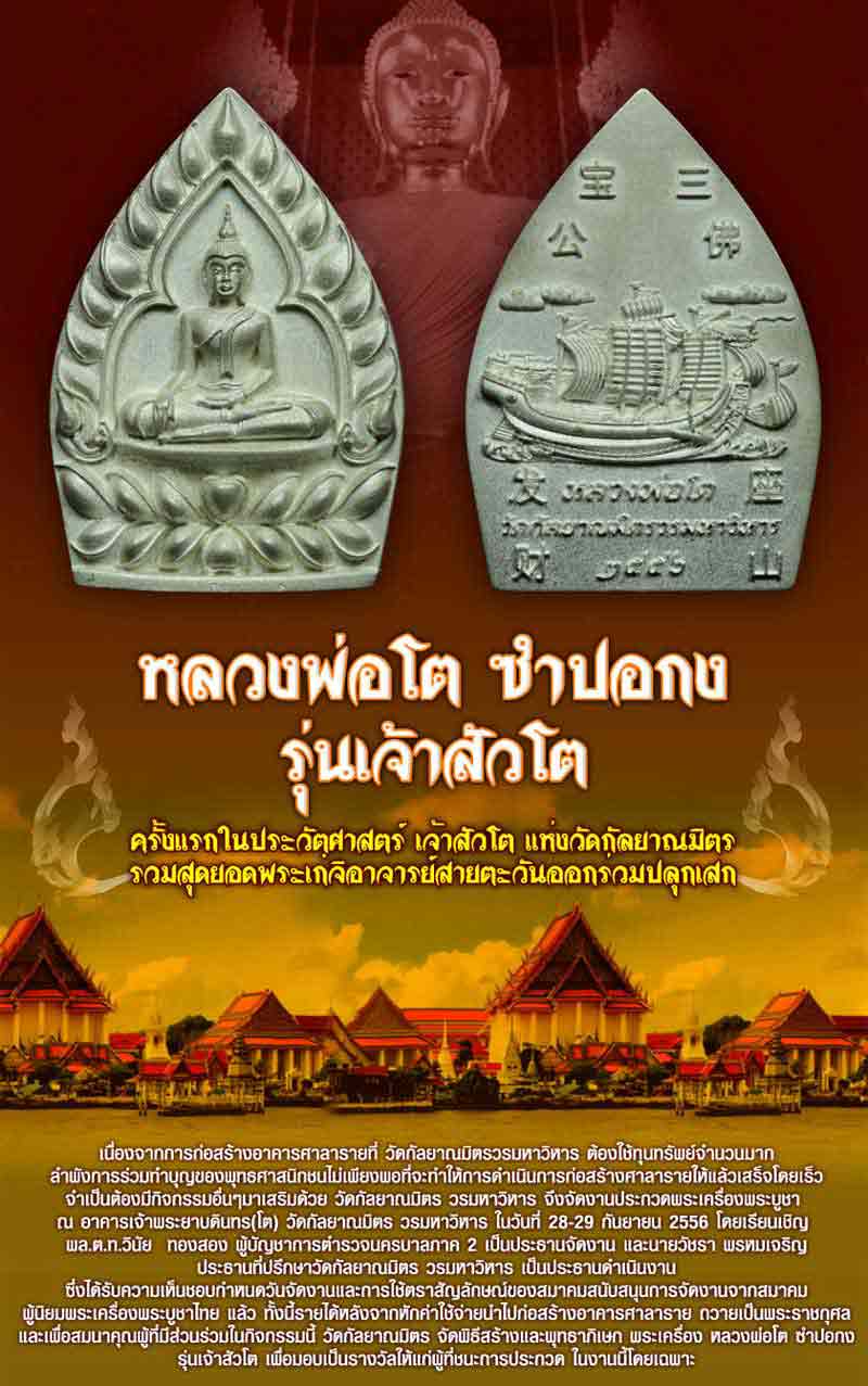 เนื่องจากการก่อสร้างอาคารศาลารายที่ วัดกัลยาณมิตร วรมหาวิหาร ต้องใช้ทุนทรัพย์จำนวนมาก ลำพังการร่วมทำบุญของพุทธศาสนิกชนไม่เพียงพอที่จะทำให้การดำเนินการก่อสร้างศาลารายให้แล้วเสร็จโดยเร็ว จำเป็นต้องมีกิจกรรมอื่นๆมาเสริมด้วย วัดกัลยาณมิตร วรมหาวิหาร จึงจัดงานประกวดพระเครื่องพระบูชา ณ อาคารเจ้าพระยาบดินทร(โต) วัดกัลยาณมิตร วรมหาวิหาร ในวันที่ 28-29 กันยายน 2556 โดยเรียนเชิญ พล.ต.ท.วินัย ทองสอง ผู้บัญชาการตำรวจนครบาลภาค 2 เป็นประธานจัดงาน และนายวัชรา พรหมเจริญ ประธานที่ปรึกษาวัดกัลยาณมิตร วรมหาวิหาร เป็นประธานดำเนินงาน ซึ่งได้รับความเห็นชอบกำหนดวันจัดงานและการใช้ตราสัญลักษณ์ของสมาคมสนับสนุนการจัดงานจากสมาคมผู้นิยมพระเครื่องพระบูชาไทย แล้ว ทั้งนี้รายได้หลังจากหักค่าใช้จ่ายนำไปก่อสร้างอาคารศาลาราย ถวายเป็นพระราชกุศล และเพื่อสมนาคุณผู้ที่มีส่วนร่วมในกิจกรรมนี้ วัดกัลยาณมิตร จัดพิธีสร้างและพุทธาภิเษก พระเครื่อง หลวงพ่อโต ซำปอกง รุ่นเจ้าสัวโต เพื่อมอบเป็นรางวัลให้แก่ผู้ที่ชนะการประกวด ในงานนี้โดยเฉพาะ
