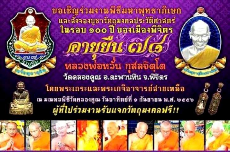 ขอเชิญร่วมงานพิธีมหาพุทธาพิเษกและสั่งจองบูชาวัตถุมงคลประวัติศาสตร์ในรอบ100ปี ของเมืองพิจิตร หลวงพ่อหวั่น กุสลจิตโต รุ่นอายุยืน๗๘ วัดคลองคูณ อ.ตะพานหิน จ.พิจิตร