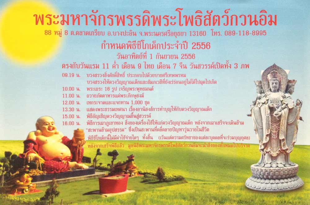 โดยในปีนี้่จะได้จัดขึ้นที่มูลนิธิพระมหามงคลพุทธนิมิตอวโลกิเตศวร (กวนอิม) จ.อยุธยาฯ ณ วันที่ 1 กันยายน พ.ศ.2556 ซึ่งตรงกับวันอาทิตย์นี้ครับ