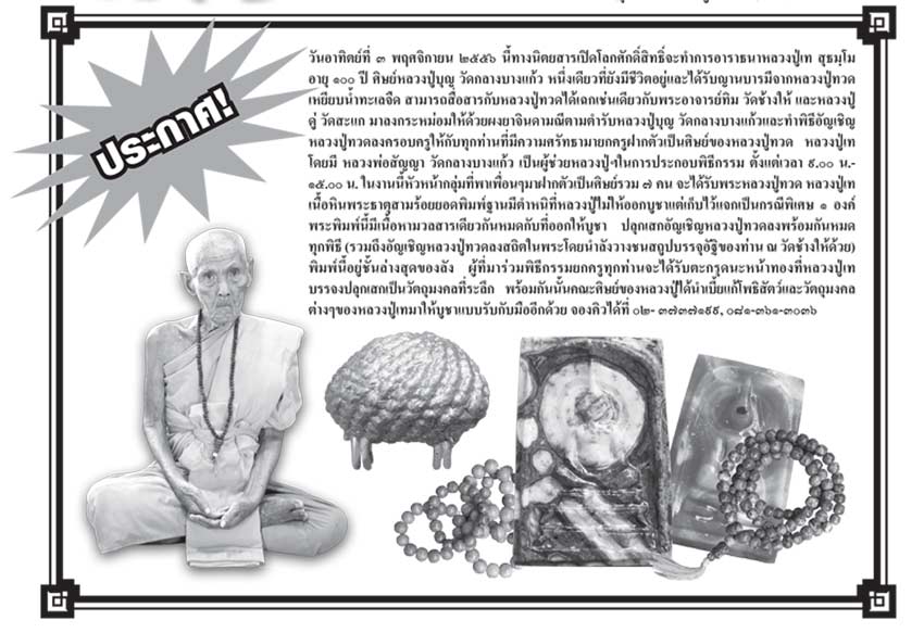ทางนิตยสารเปิดโลกศักดิ์สิทธิ์ขอเชิญทุกท่านร่วมพิธีลงกระหม่อมด้วยผงยาจินดามณี,ครอบหลวงปู่ทวดโดยหลวงปู่เท สุธมฺโม อายุ 100 ปี ท่านสามารถรับญาณบารมีจากหลวงปู่ทวด