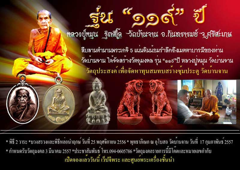 | หัวข้อกระทู้ : ประชาสัมพันธ์เรื่องรายการจองวัตถุมงคลหลวงปู่หมุนรุ่น 119 ปี ครับ... |