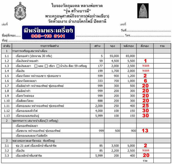 มีพร้อมพระเครื่องขออนุญาตแจ้งรายละเอียดการเปิดจองวัตถุมงคล หลวงพ่อทวด รุ่น สร้างบารมี พระครูอนุศาสน์กิจจาทร (พ่อท่านเขียว) วัดห้วยเงาะ อ.โคกโพธิ์ จ.ปัตตานี