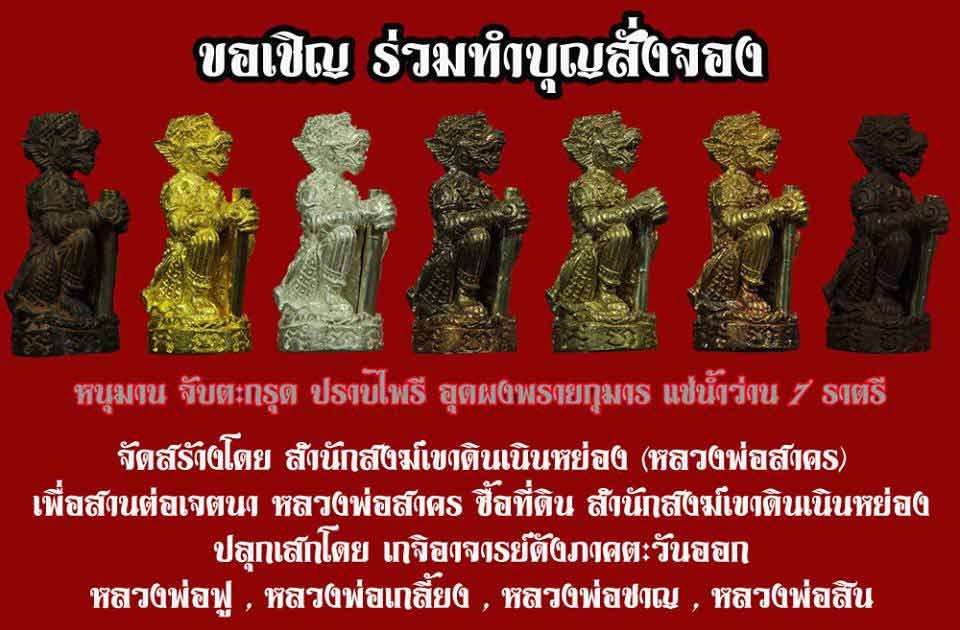 หลวงพ่อสาครเมตตาให้จัดสร้างหนุมาน มหาปราบไตรจักรเพื่อสร้างหอระฆัง และสำเร็จลุล่วงไปด้วยดี ทางวัดยังได้สร้างหอฉันท์ใหม่ และต่อเติมหลายๆอย่างภายในวัด-ปี56 ทางสำนักสงฆ์ปรึกษาหลวงพ่อสาครเพื่อซื้อที่ดินที่เหลือข้างวัด หลวงพ่อท่านเห็นด้วย เพราะหากไม่ซื้อวันนี้วันหน้าอาจจะแพงกว่า จึงได้ออกวัตถุมงคล ยอดขุนพลและกุมารทอง เหตุการณ์ไม่คาดคิด หลวงพ่อสาครท่านจากพวกเราไปก่อน จึงทำให้ทางวัดยังไม่สามารถหาเงินมาจ่ายค่าที่ดินได้ครบตามกำหนด เท่าที่ทราบ ที่ดินประมาณ18ไร่ ประมาณ3.5ล้านบาท-ปี57นี้ ทางสำนักสงฆ์จึงมีความประสงค์จัดสร้างหนุมานขึ้นมาใหม่ ซึ่งทางวัดยังขาดปัจจัยอีก 2 ล้านบาท มีกำหนดครบวันกำหนด เดือนกันยายน นี้เรื่องที่มาที่ไปก็คร่าวๆมาแบบนี้แหละครับมาพูดถึงเรื่องชิ้นงาน ที่ผมเข้าไปคุยความต้องการของทางพระอาจารย์สุพจน์(เจ้าสำนักสงฆ์)อดีตพระเลขาหลวงพ่อสาคร และได้ร่ำเรียนวิชากับหลวงพ่อมาเช่นกัน ท่านอยากให้หนุมานล้อพิมพ์ของ อาจารย์ และเปลี่ยนรูปแบบผสมกับ หนุมานจับหลักของหลวงพ่อฟูจำนวนสร้างอาจจะไม่มากน่ะครับ ทางวัดมีทุนจัดสร้างไม่มากพระอาจารย์สุพจน์ ฝากบอกว่า รุ่นนี้ ทำไม่แพ้รุ่นก่อนแน่นอนครับเมื่อ2วันก่อน ทางวัดก็จัดเตรียมว่านแล้วครับ กำลังหั่นกันสดๆเลยครับปีนี้จะได้บูชาหนุมานจับตะกรุดปราบไพรีอุดผงพรายกุมารของหลวงพ่อสาครแช่น้ำว่านตามแบบฉบับเกจิอาจารย์ดังปลุกเสก สายหนุมานในภาคตะวันออกฝากไว้เพียงเท่านี้ก่อนครับ