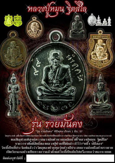 วัดป่าหนองหล่ม ต.หนองแวง อ.วัฒนานคร จ.สระแก้ว ขอเรียนเชิญสั่งจองเช่าบูชาวัตถุมงคล หลวงปู่หมุน ฐิตสีโล พระเกจิปฐมบทตำรับการสร้างวัตถุมงคลด้วยเหล็กน้ำพี้อันลือเลื่อง ถือเป็นต้นแบบที่ได้รับความนิยมยิ่งในหลายพระคณาจารย์ยุคปัจจุบัน บัดนี้พระอาจารย์ขวัญเมือง สุธัมโม เจ้าอาวาสวัดป่าหนองหล่ม มีดำริสร้างวัตถุมงคลชุดเหล็กน้ำพี้ (และเนื้อต่างๆ) รำลึกคุณครูบาอาจารย์และหาปัจจัยสร้างมหาวิหาร เพื่อประดิษฐานองค์หลวงปู่หมุน (ยืน) จำลองขนาดเท่าองค์จริง และใช้เป็นศาสนสถานในกิจต่างๆ อันสมควร... อีกทั้งเป็นทุนในการบูรณปฏิสังขรณ์วิหารพระแก้ว, วิหารพรหมและศาสนสถานภายในวัดป่าหนองหล่ม จ.สระแก้ว สืบต่อไป ด้วยการสร้างวัตถุมงคล "รุ่นรวยมั่นคง" อาทิ เหรียญหล่อโบราณหลวงปู่หมุน, พระแก้วมรกต เหล็กน้ำพี้, รูปหล่อหลวงปู่หมุน ฯลฯ ... พระเกจิที่เข้าร่วมพิธีพุทธาภิเษก วันที่ 1 มิ.ย.2557 เวลา 13.39 น. ภายในวิหารพระแก้ว (หลังเก่า) วัดป่าหนองหล่ม อาทิ หลวงพ่อเพิ่ม วัดป้อมแก้ว จ.พระนครศรีอยุธยา, หลวงพ่อพูน วัดบ้านแพน จ.พระนคร ศรีอยุธยา, หลวงพ่อเอียด วัดไผ่ล้อม จ.พระนครศรีอยุธยา, หลวงพ่อสนธิ์ วัดทุ่งพระ จ.สระแก้ว, หลวงปู่บุญมา วัดบ้านแก่ง จ.ปราจีนบุรี เป็นต้น ผู้ที่เข้าร่วมพิธีมีวัตถุมงคลหลวงปู่หมุนแจกให้ฟรี จำนวนจำกัด สอบถามรายละเอียดและจองวัตถุมงคลที่วัดป่าหนองหล่ม อ.วัฒนานคร จ.สระแก้ว โทร.08-5449-5542.. |